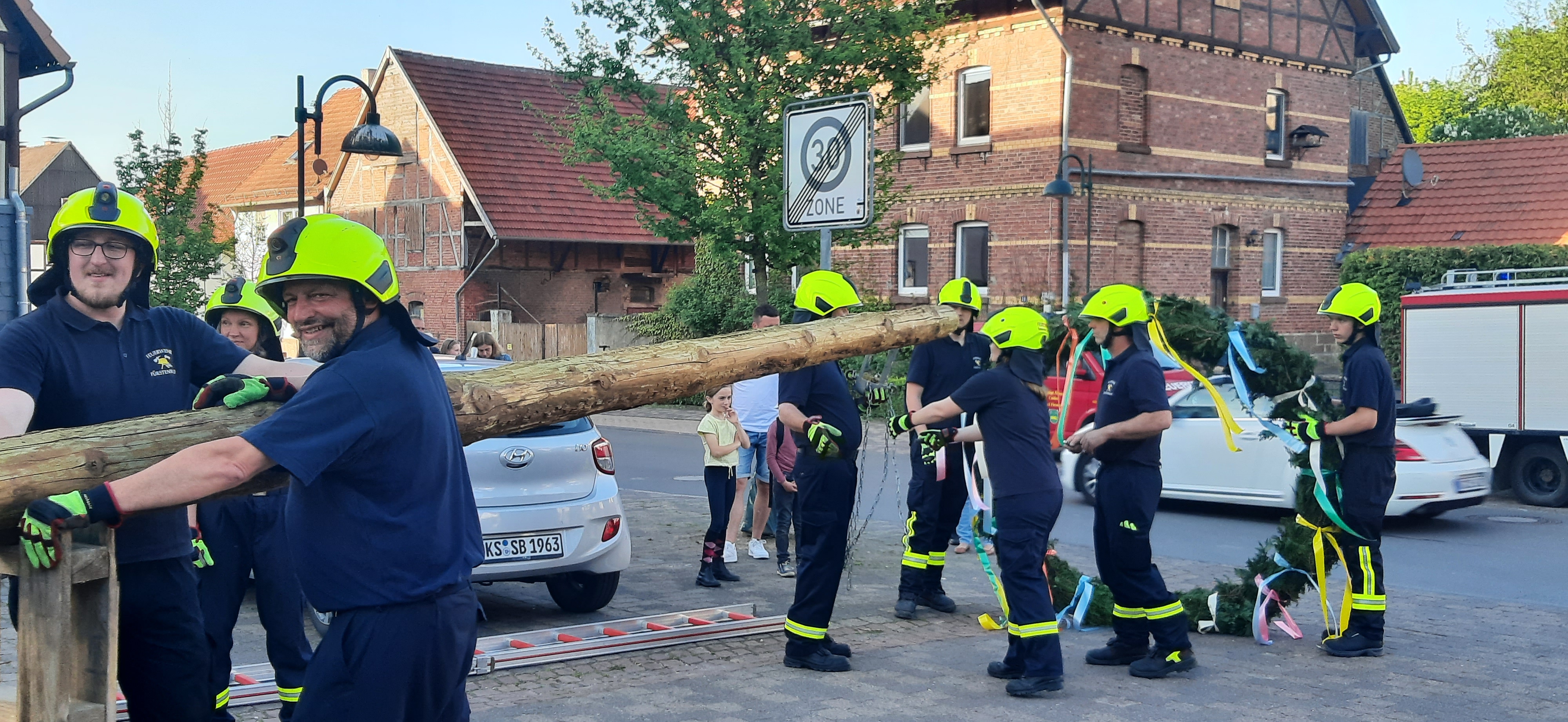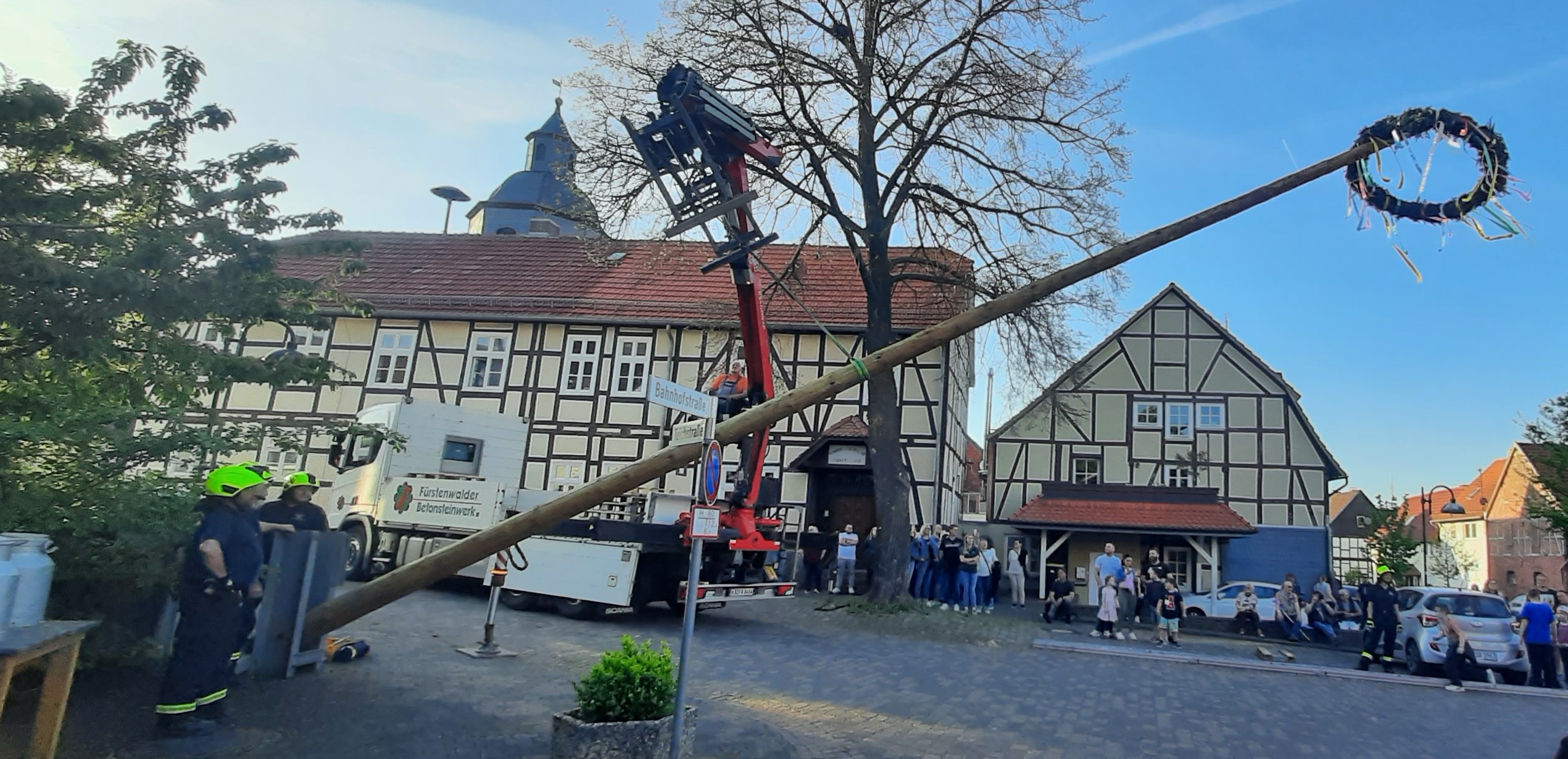 Fürstenwald bebte und das Wetter spielte mit. Der Maibaum konnte bei herrlichen Sonnenschein, unter den Augen vieler Bürgerinnen und Bürgern, von der Freiwilligen Feuerwehr mit technischer Hilfe durch das Fürstenwalder Betonsteinwerk auf dem Dorfplatz aufgestellt werden. Hier zeigte sich die gute Arbeit, die die Mitglieder des Gesangsvereins „Flotte Töne“ beim Binden des Kranzes geleistet haben.
