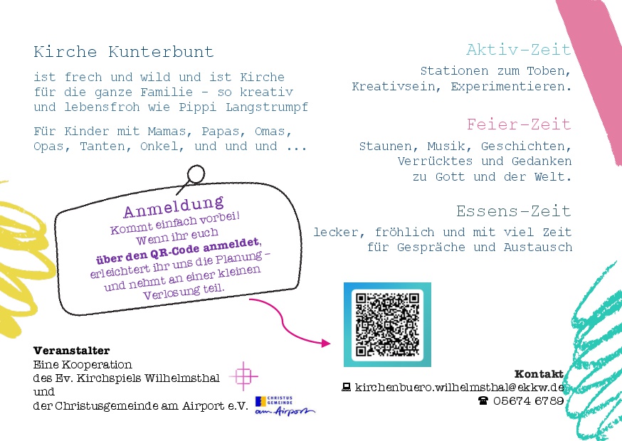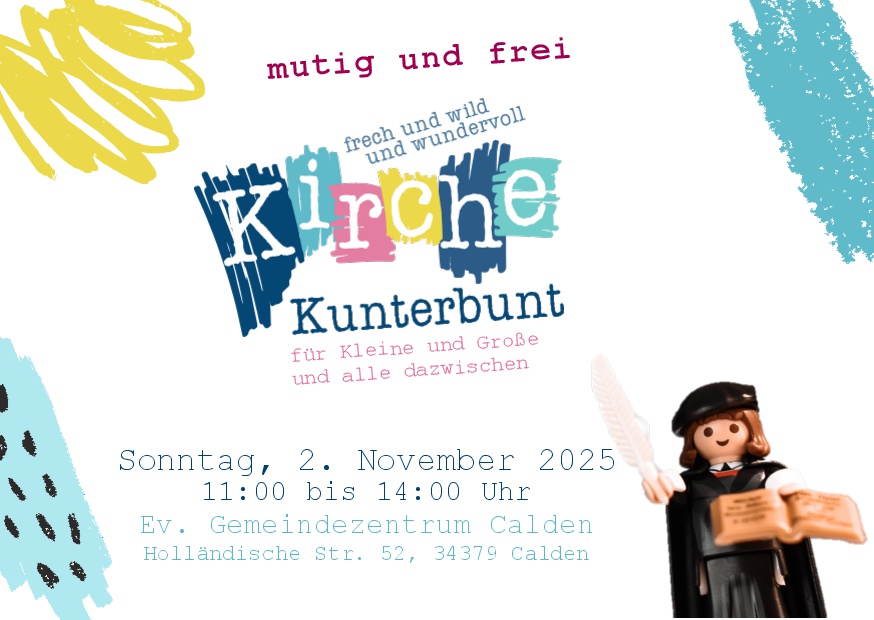 Die Christusgemeinde am Airport e.V. veranstaltet zusammen mit dem Ev. Kirchspiel Wilhelmsthal am 2. November 2025 ab 11:00 Uhr im Gemeindezentrum Calden die „Kirche Kunterbunt“.