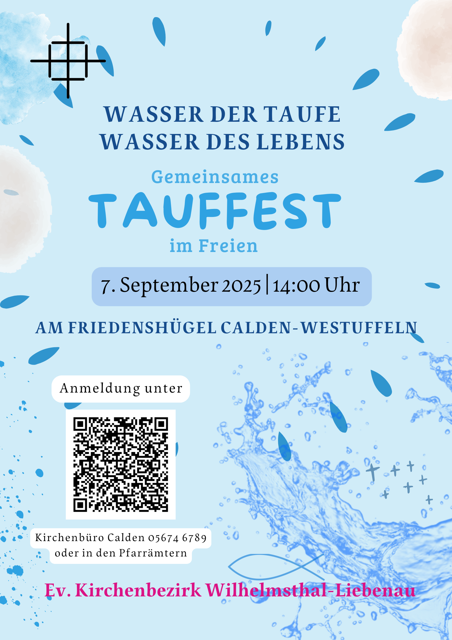 Der Gottesdienst am 7. September um 14:00 Uhr steht unter der Überschrift "Wasser der Taufe - Wasser des Lebens" und wird inhaltlich von Pfarrer Frank Himmelmann aus Calden und Pfarrer David Seibel aus Liebenau vorbereitet.